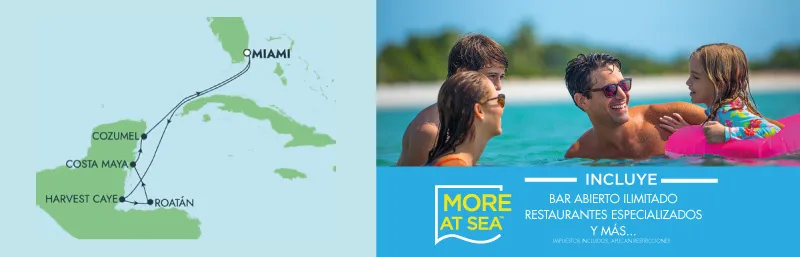 ITINERARIO: Miami, Usa • Islas De La Bahía De Roatán, Honduras • Harvest Caye, Belice • Costa Maya, México • Cozumel, México • Miami, Usa.