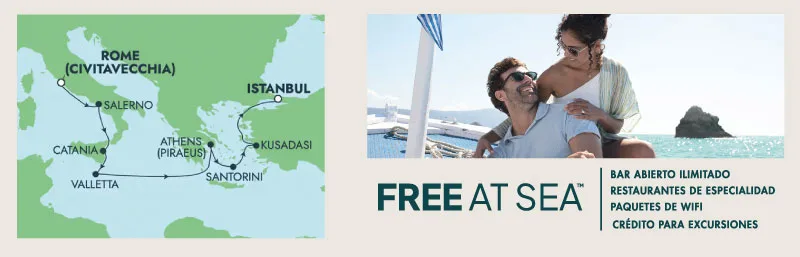 FREE AT SEA: • BAR ABIERTO ILIMITADO (PARA PASAJEROS MAYORES DE 21 AÑOS) • 3 CENAS DE ESPECIALIDAD (1 Y 2 PASAJERO EN CABINA) • 150 MINUTOS DE INTERNET POR PERSONA • CRÉDITO DE USD $50 PARA EXCURSIONES EN PUERTO.