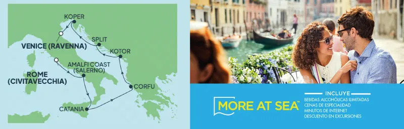 7 NOCHES: Roma (Civitavecchia), Italia • Salerno, Italia • Catania, Italia • Corfú, Grecia • Kotor, Montenegro • Split, Croacia • Koper, Eslovenia • Venecia (Ravena),Italia.