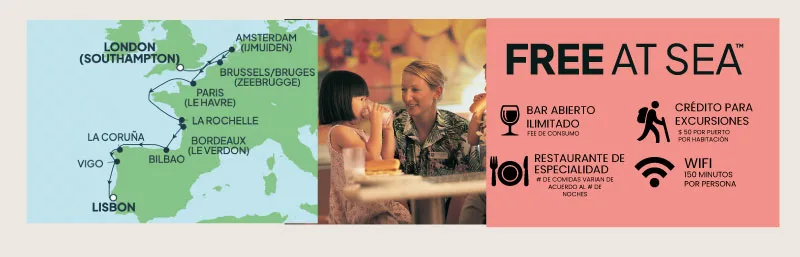 10 PUERTOS DE ESCALA: Londres (Southampton), Reino Unido • Ámsterdam (Ijmuiden), Países Bajos • Bruselas/Brujas (Zeebrugge), Bélgica • París (Le Havre), Francia • La Rochelle, Francia • Burdeos (Le Verdon), Francia • Bilbao ,España • La Coruña, España • Vigo, España • Lisboa, Portugal.