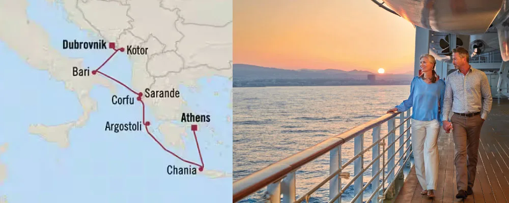 ITINERARIO: Atenas (El Pireo), Grecia • Chania (Creta), Grecia • Argostoli (Cefalonia), Grecia • Corfú, Grecia • Sarande, Albania • Bari, Italia • Kotor, Montenegro • Dubrovnik, Croacia.