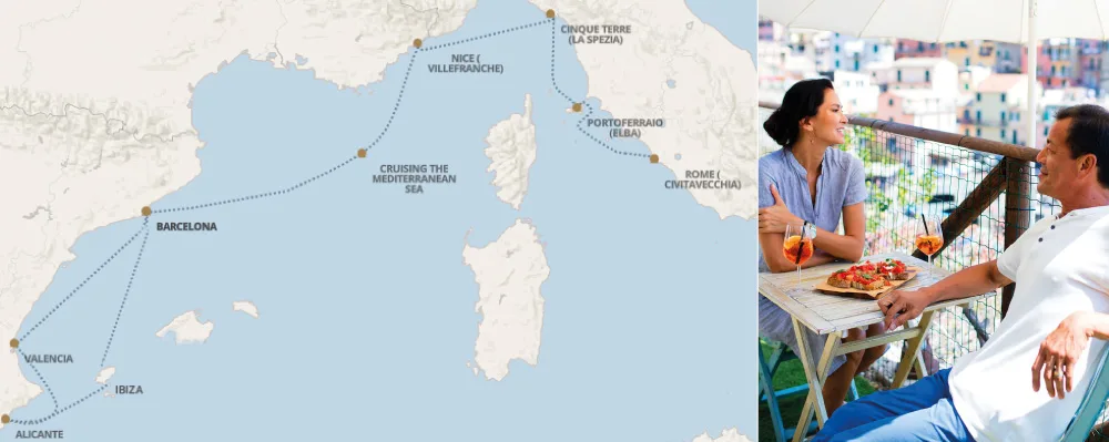 ITINERARIO: Roma (Civitavecchia), Italia • Portoferraio (Elba), Italia • Cinque Terre (La Spezia), Italia• Niza (Villefranche), Francia • Navegando Por El Mar Balear • Alicante, España • Valencia, España • Ibiza, España • Barcelona (Tarragona), España.